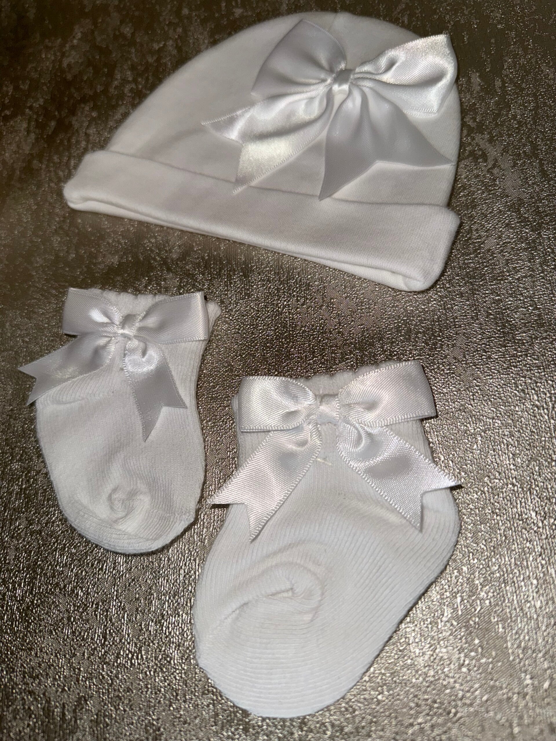 Lieve baby set met mutsje en sokjes, afgewerkt met een elegante satijnen strik. Perfect voor de eerste maanden of als kraamcadeau.