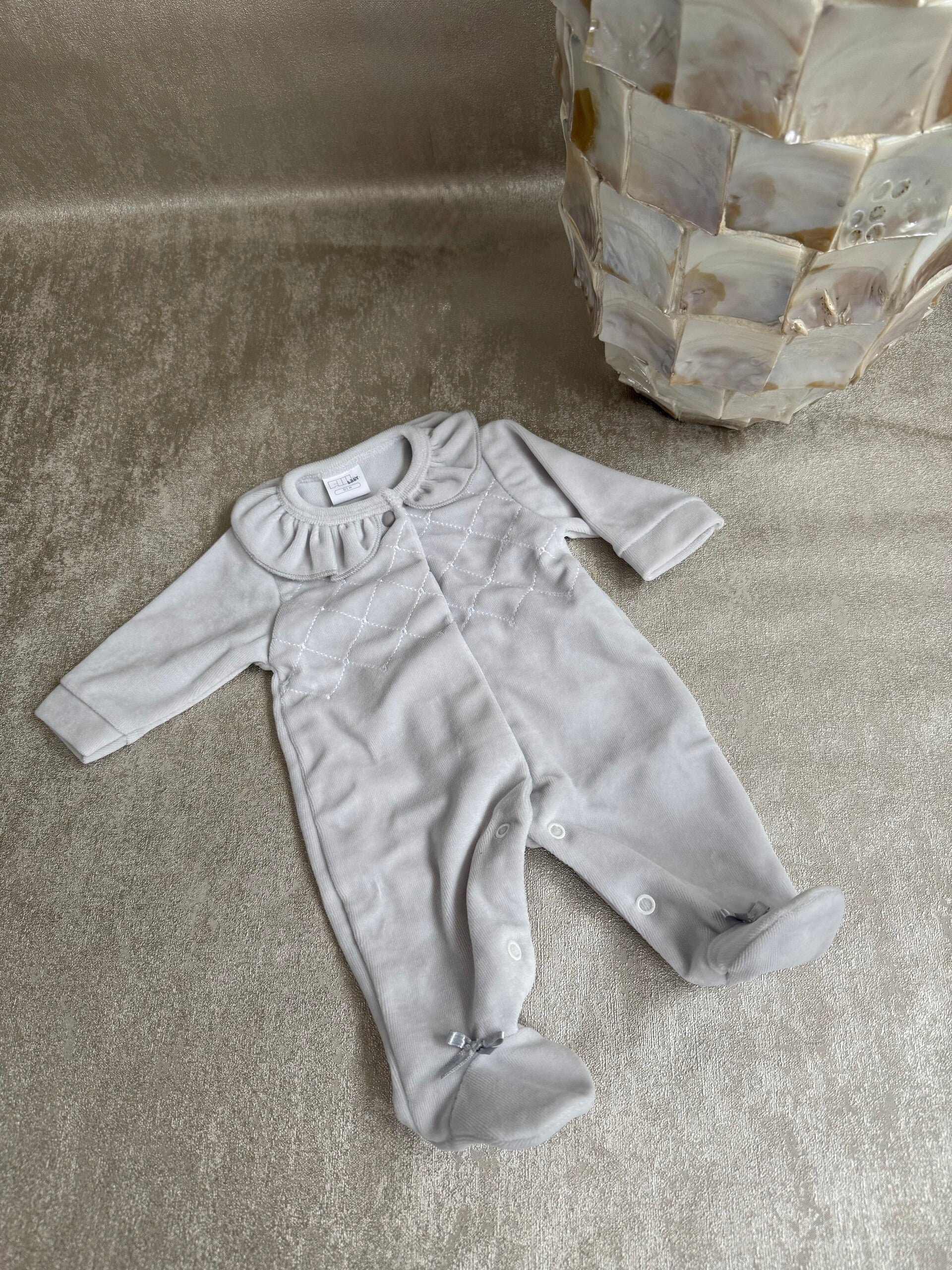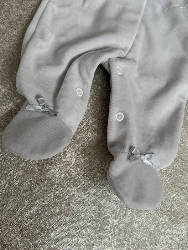 Licht grijs velours boxpakje met ruffle kraag. Drukknoopjes over de borst en tussen de beentjes. Schattige strikjes op beide voetjes