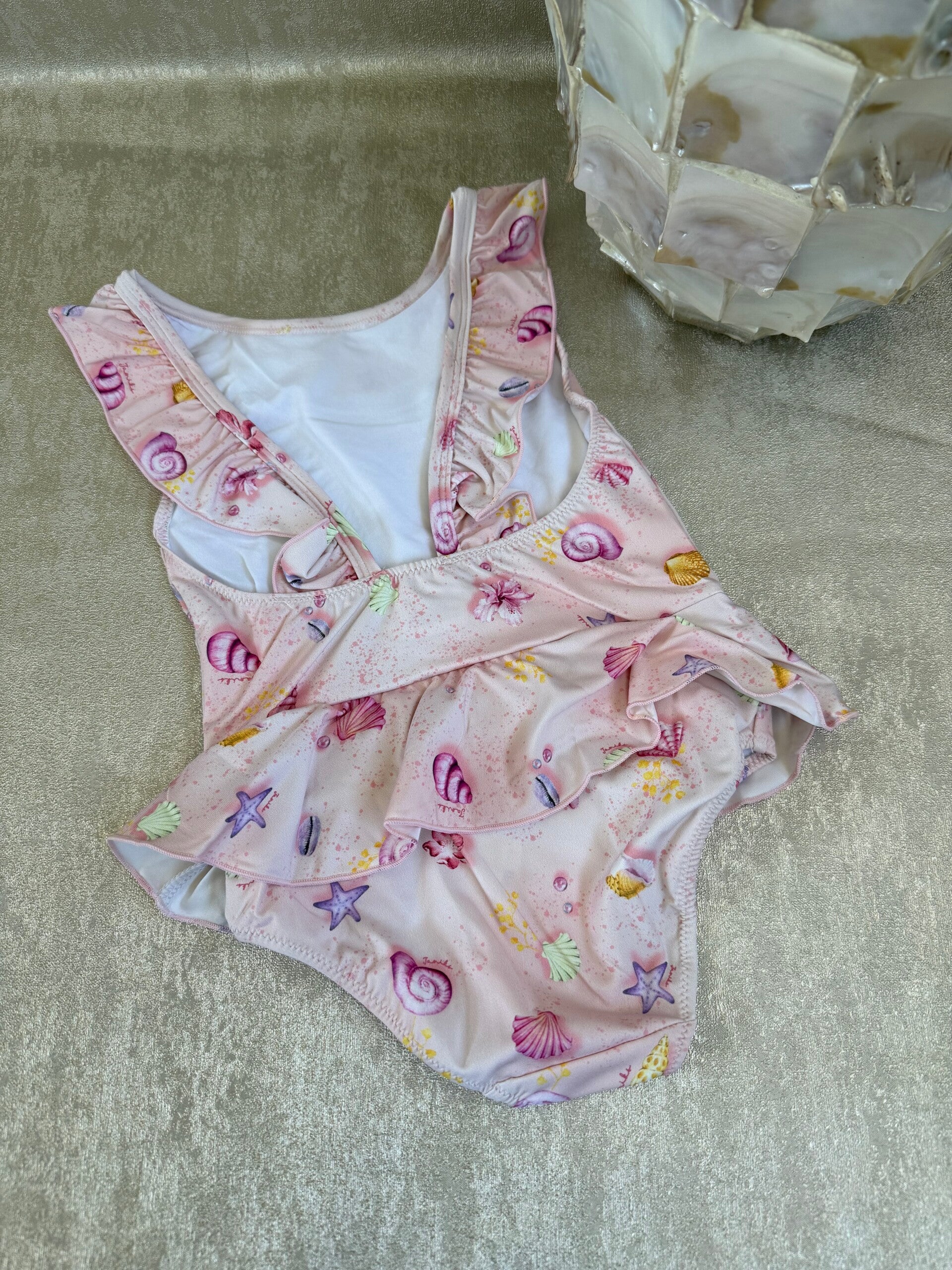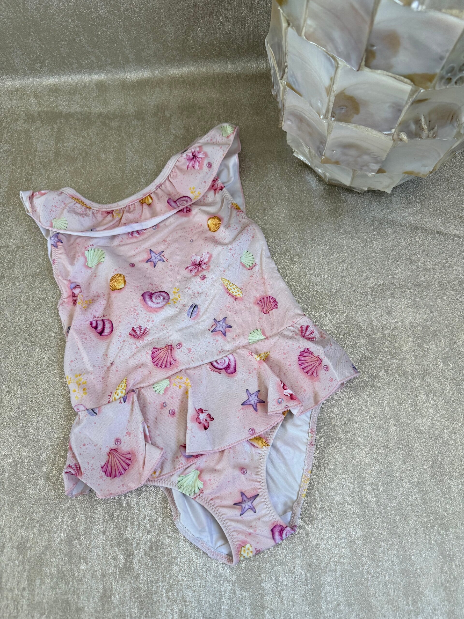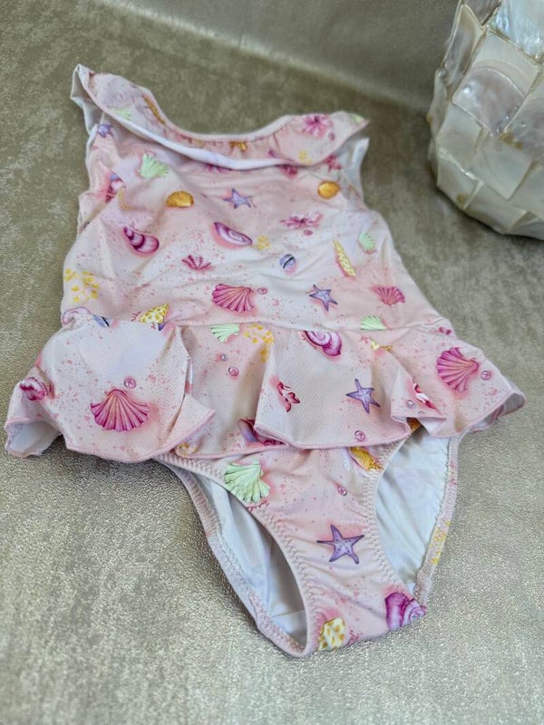 Dit schattige roze badpak is een echte must-have voor zonnige dagen! Het badpak is versierd met speelse schelpjes, zeesterren en zachte pastelkleuren die zorgen voor een echte zeemeermin-look.